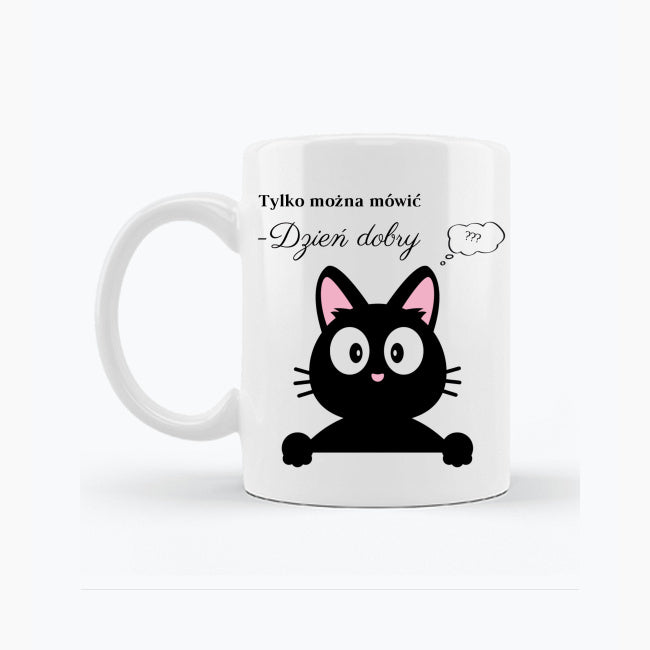 Biały kubek ceramiczny z napisem „Tylko można mówić dzień dobry” – 330 ml, idealny na prezent